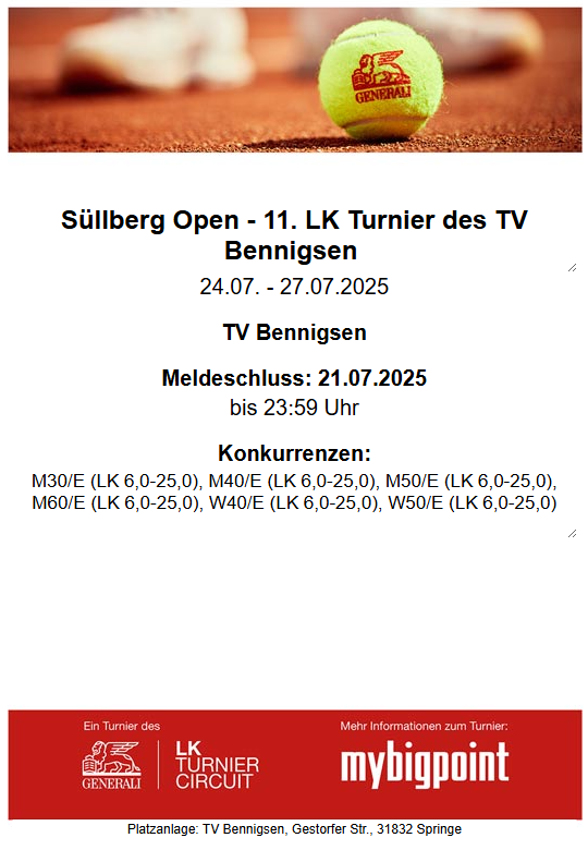 wir freuen uns, euch zu den 11. Süllberg Open beim TV Bennigsen einzuladen! Dieses traditionsreiche Tennisturnier verspricht spannende Matches, sportlichen Ehrgeiz und geselliges Beisammensein.
